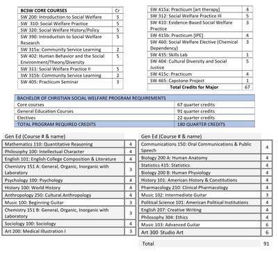 This degree consists of a minimum of 180 quarter units. The BCSW degree combines liberal arts and pre-professional coursework for a broad foundation. The vision for our degrees comes from Matthew 4: 23 (NLT): “Jesus traveled throughout the region of Galilee, teaching in the synagogues and announcing the Good News about the Kingdom. And he healed every kind of disease and illness.” This degree prepares students to follow in Christ’s footsteps by bringing healing to the ills of society.